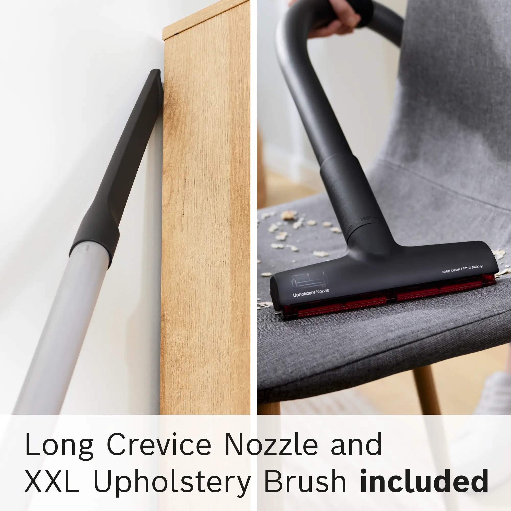 Included accessories :1 x crevice nozzle, 1 x furniture brush, 1 x upholstery nozzle, 1 x universal nozzle, 1 x turbo nozzle, 1 x hard floor nozzle
