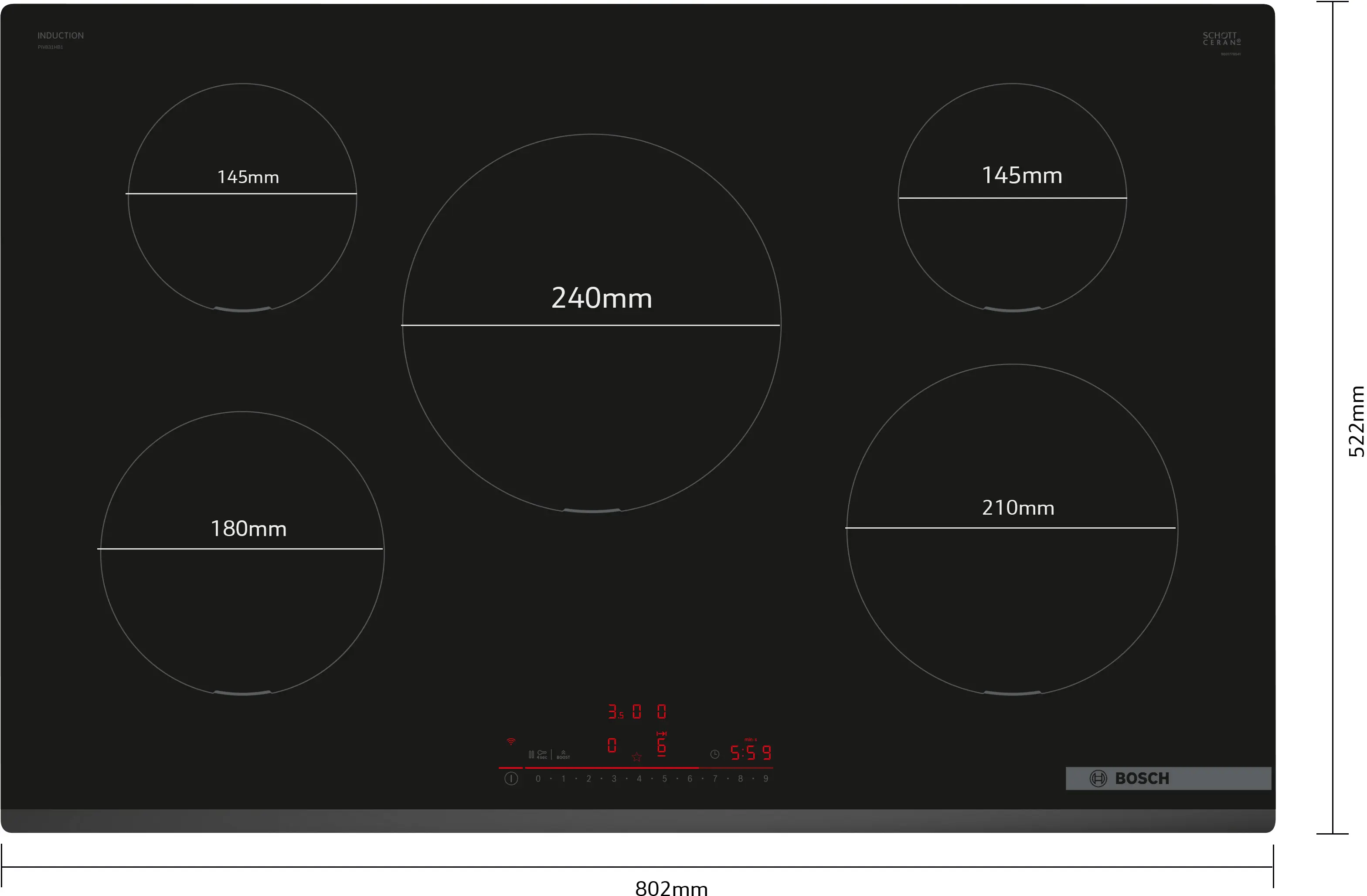 Dimensions of the heating elements :1 x (18,0 cm Ø), 2 x (14,5 cm Ø), 1 x (24,0 cm Ø), 1 x (21,0 cm Ø)