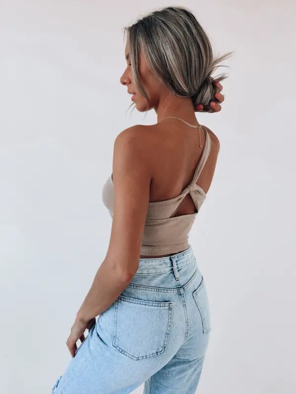 Our Camilla Ribbed Crop Top is off of one shoulder. This top has a knotted fabric detail on the strap and on the back. This would be the perfect top to wear with distressed denim shorts.