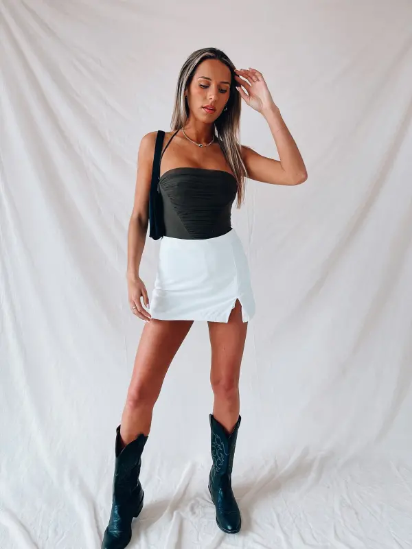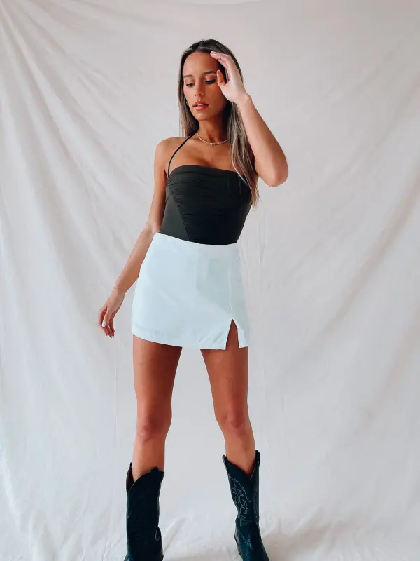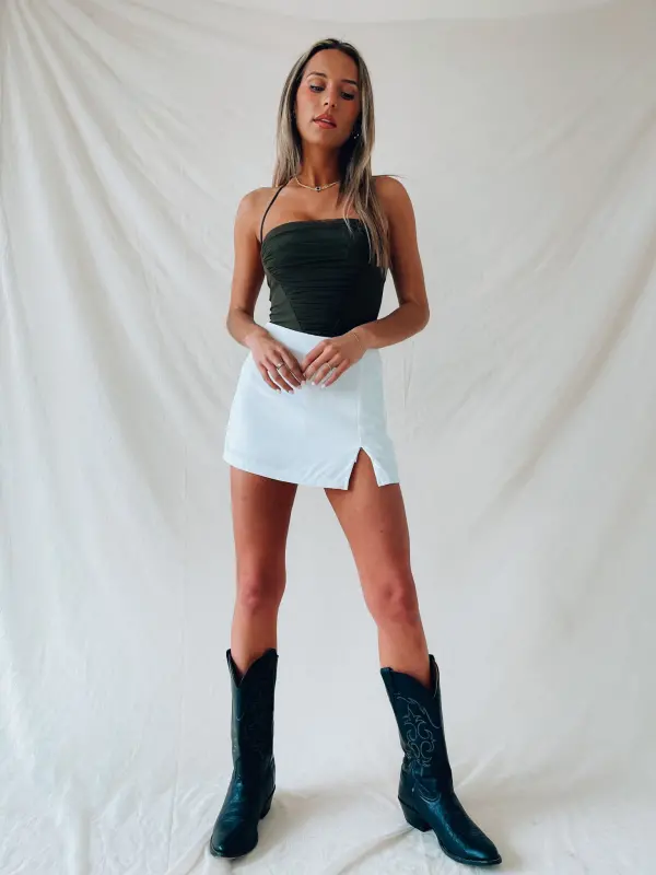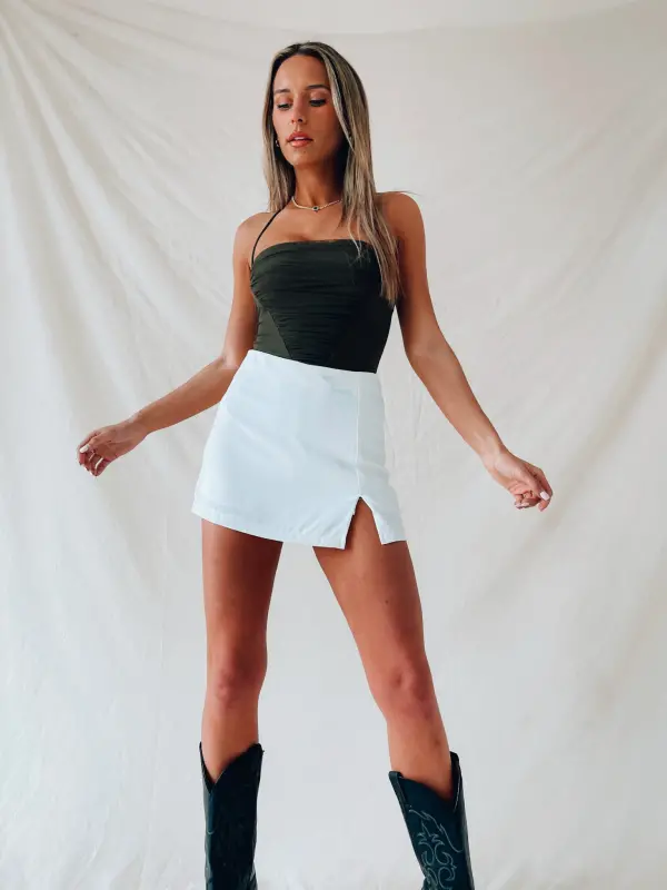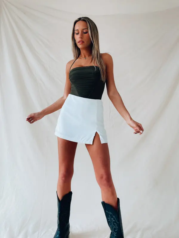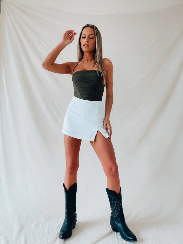Our Caria Olive Halter Bodysuit has a self tie neck closure and a snap button closure. The bodysuit has ruching detail on the front and has a thin sheen fabric. The inside of this bodysuit is lined.