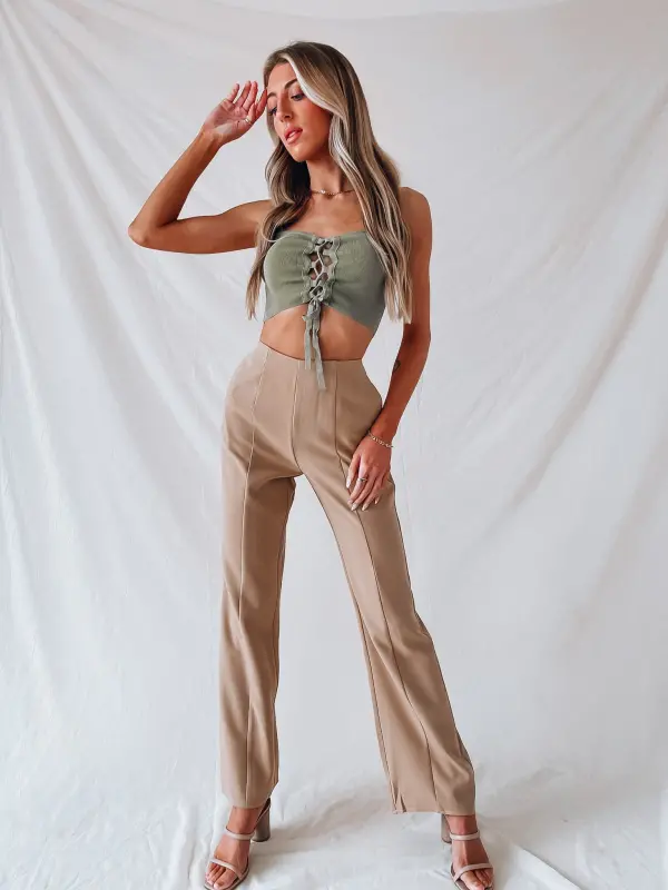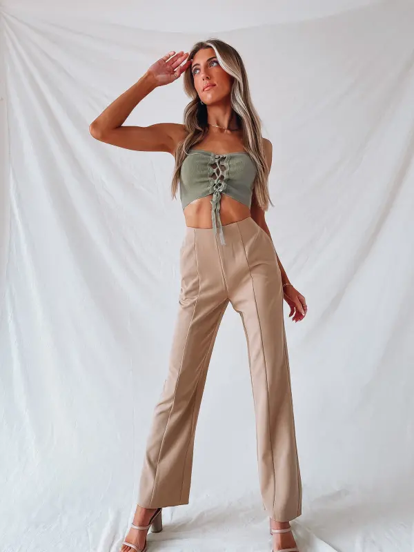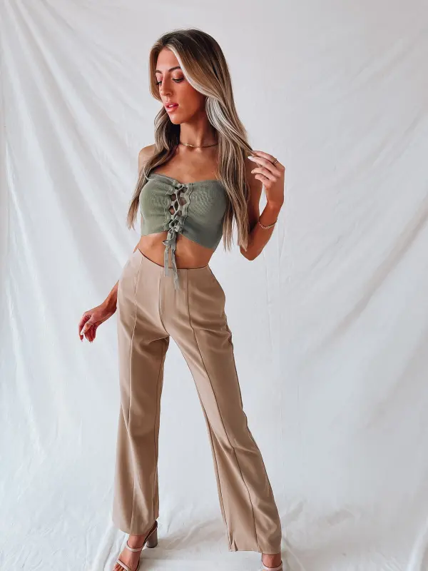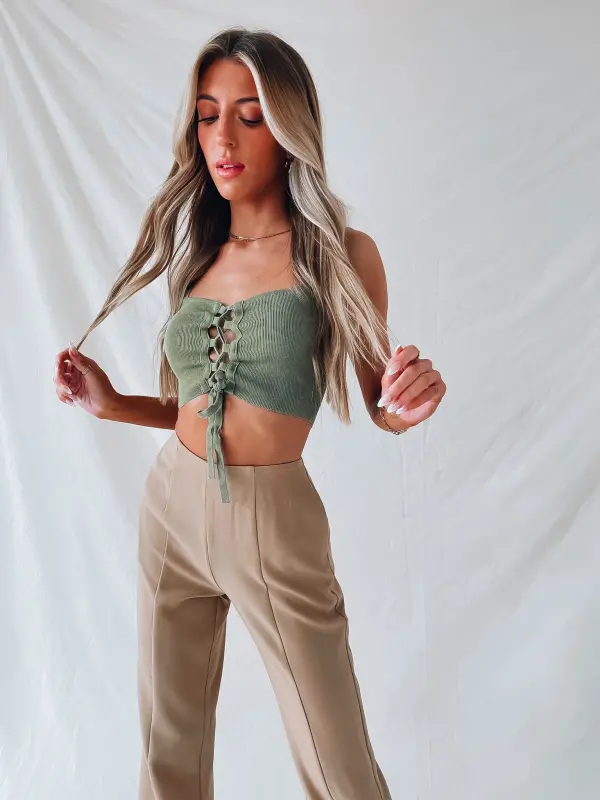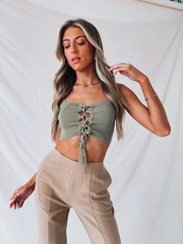 Our Coralee Lace Up Crop Top is a cropped cami tank with a self tie lace up detail. There are two thin adjustable straps. This lightweight fitted item has a ribbed fabric.