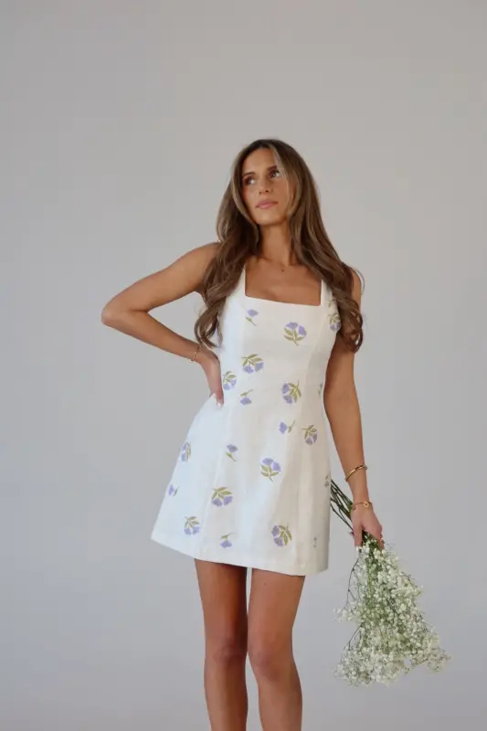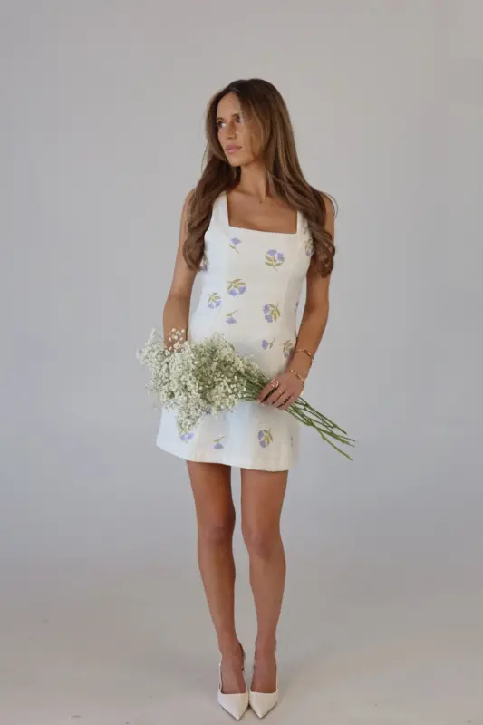 Embrace the season with the Elora Embroidered Mini Dress, designed to brighten your spring and summer wardrobe. Featuring delicate green and purple floral embellishments, a flattering square neckline, and a keyhole button closure, this dress combines charm and elegance for a refreshing, vibrant look. Designed for a flattering fit, size down for a more tailored silhouette. Simple yet stunning, this mini dress is perfect for sunny days and special occasions.