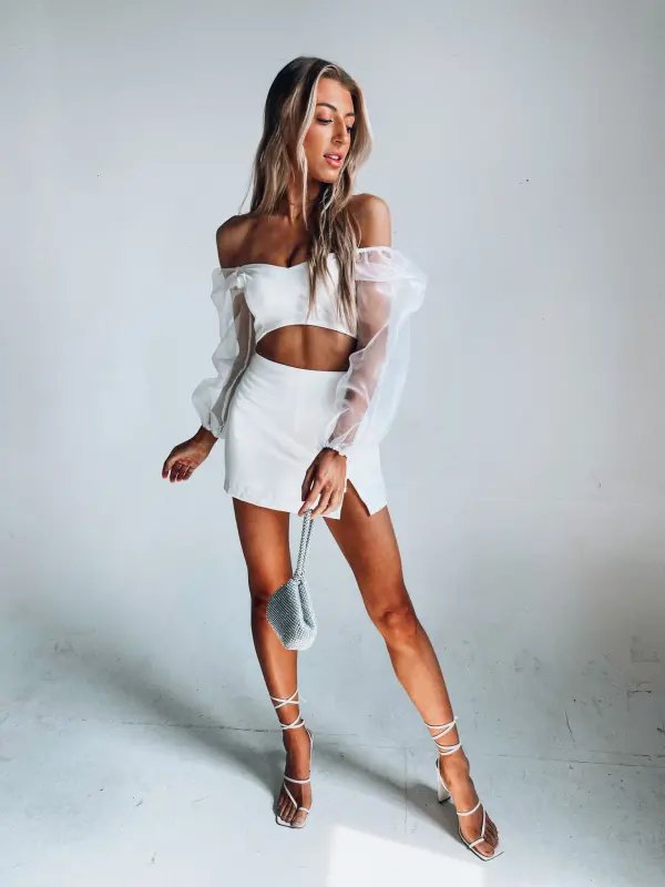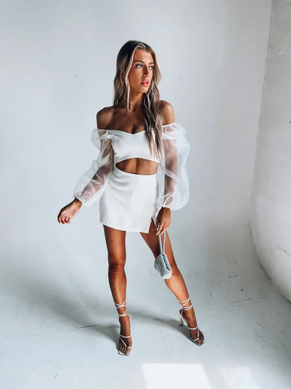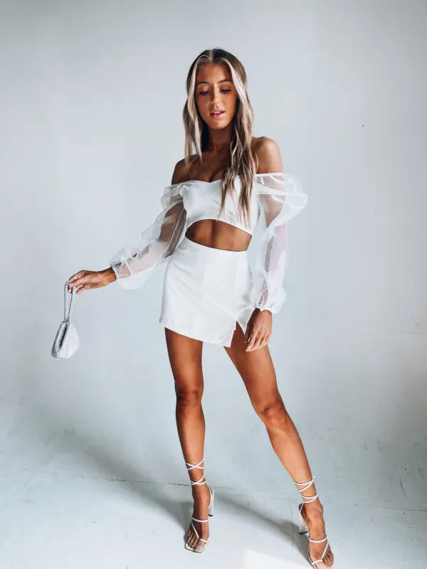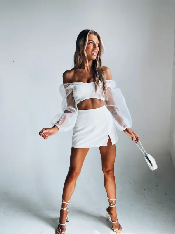 Our Kaylin Sheer Sleeve Crop Top is a fitted cropped top with long bubble sleeves that have a sheer fabric. The top does have a lining on the inside. The sleeves are meant to be worn off the shoulder.