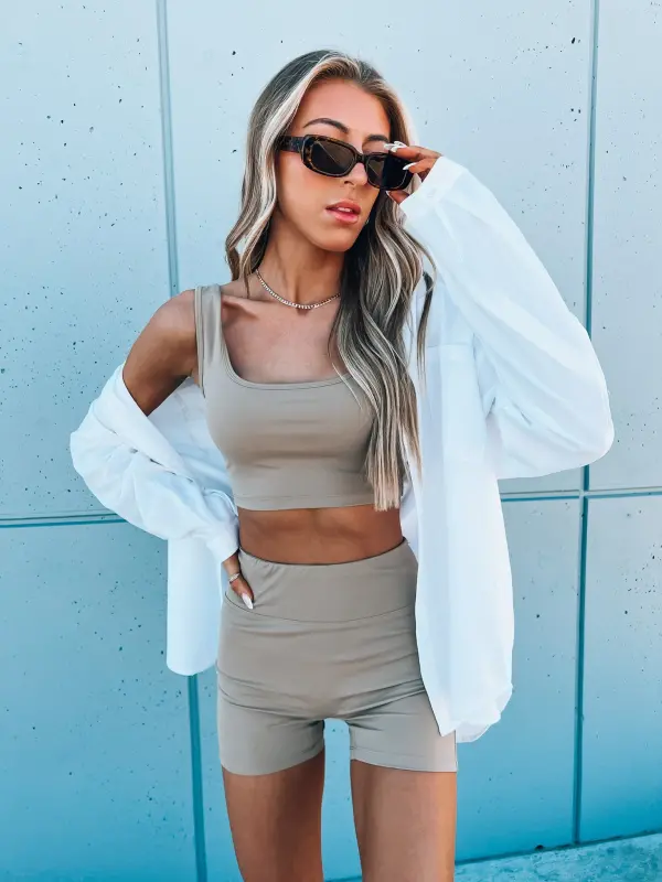 Our Lux Active Set In Taupe is a cropped two piece set. It comes with a cropped tank and biker shorts.