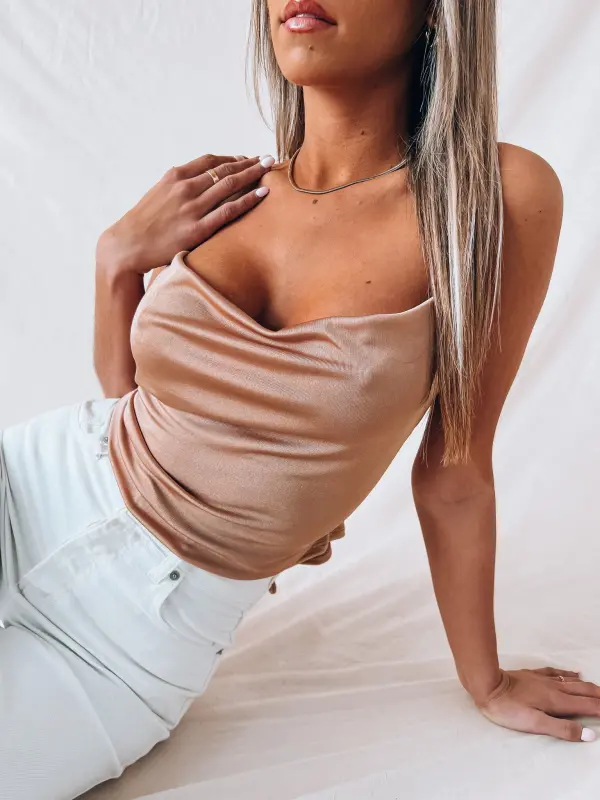 Our Nayla Cowel Neck Cami Top is a lightweight, loose fit top. The top has two thin adjustable straps and a waist tie to synch in the waist. This top has a sheen fabric.