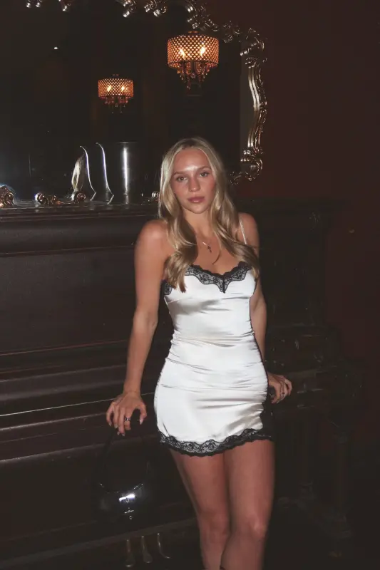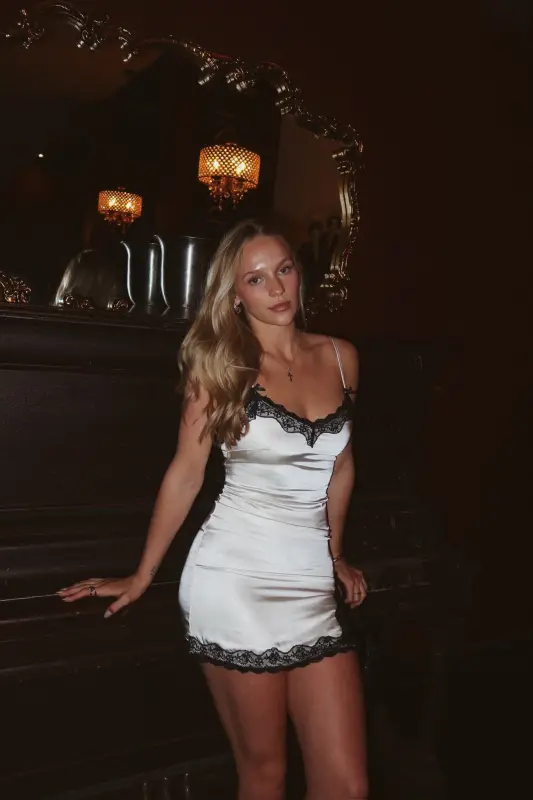 Make an unforgettable entrance in the Nessa Satin Slip Dress – a sultry yet sophisticated mini designed to turn heads at concerts, date nights, and nights out. Crafted from smooth, ivory satin, this slip dress hugs your curves in all the right places, offering a flattering fitted silhouette. The V-neckline is framed by delicate black lace trim, adding a romantic contrast that enhances the dress’s bold, feminine appeal. A daring side slit and dainty bow details add just the right amount of edge, while the adjustable spaghetti straps and hidden side zipper closure provide a secure and customizable fit. Designed with both comfort and statement style in mind, the Nessa is the ultimate go-to for a sleek, show-stopping look that effortlessly combines elegance and attitude.