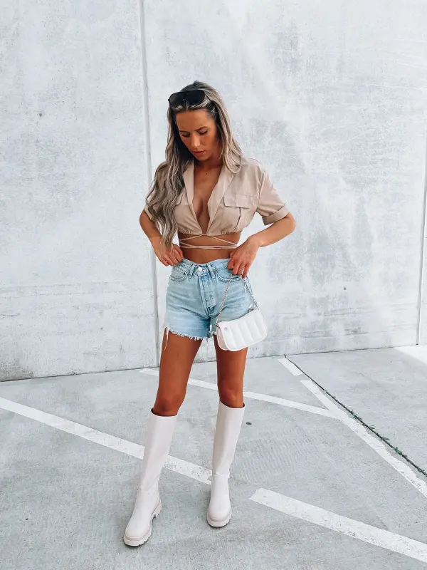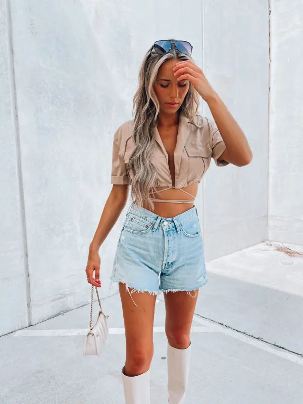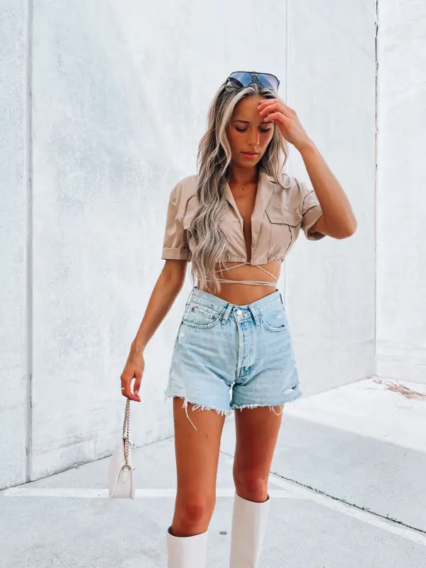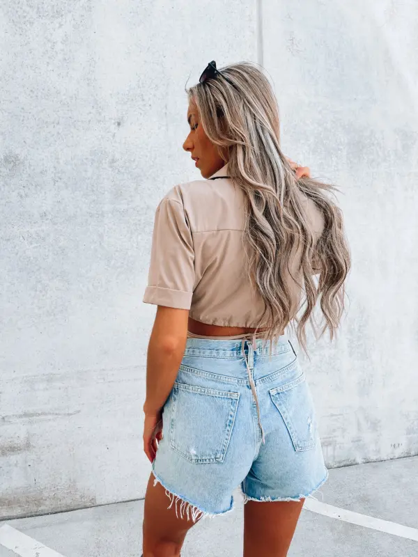 Our Piper Wrapped Up Button Down is a cropped short sleeve wrap top. This top has a collar and two front flap pockets. There is two self tie strings to wrap around the waist. This top has a lightweight, soft to the touch fabric.