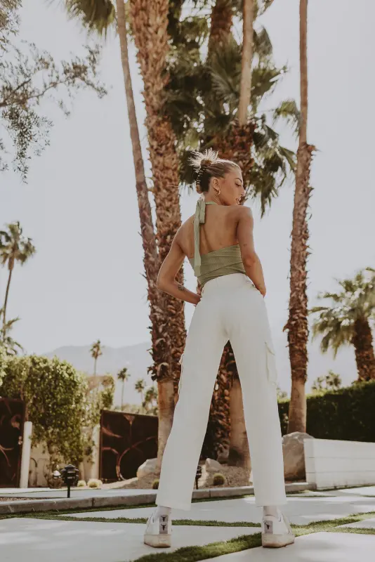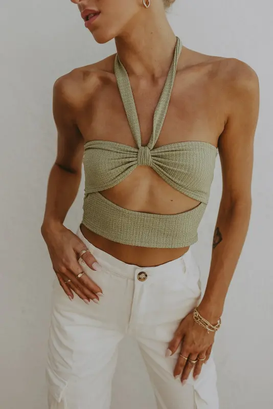 Our Selma Sage Halter Top has a fitted textured knit fabric. This top has a front cut out under the bust. The bust also has a bow like center to synch the bust together. There is a two strap tie closure for around the neck.